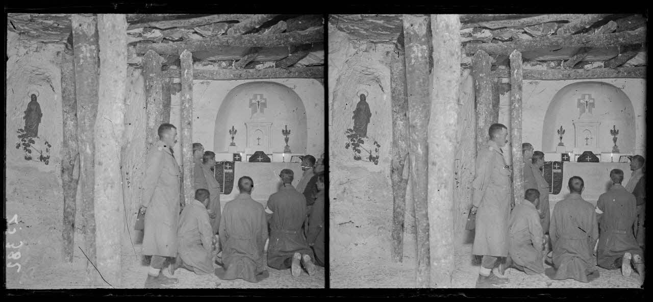 Dans la carrière du Chauffour (sur la commune de Thiescourt, Oise, Z 397 à Z 408), les soldats organisent leur cantonnement dans la carrière (cuisine, chambrée, tailleur et cordonnier, poste de secours, cimetière).