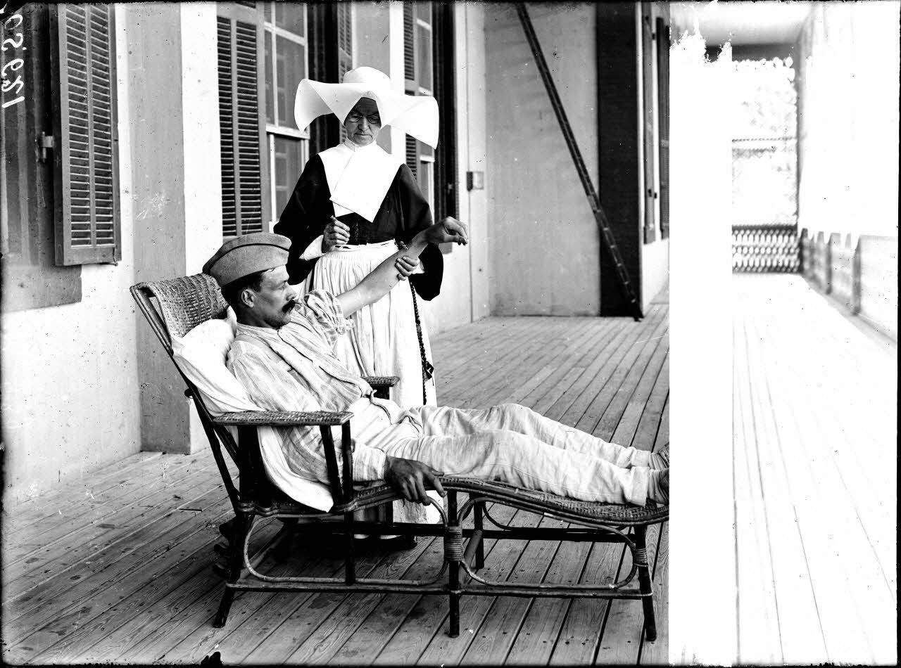 une religieuse hospitalière (sans doute de l'ordre de Saint Vincent-de-Paul) au chevet d'un blessé, à l'hôpital militaire d'Ismaïlia.