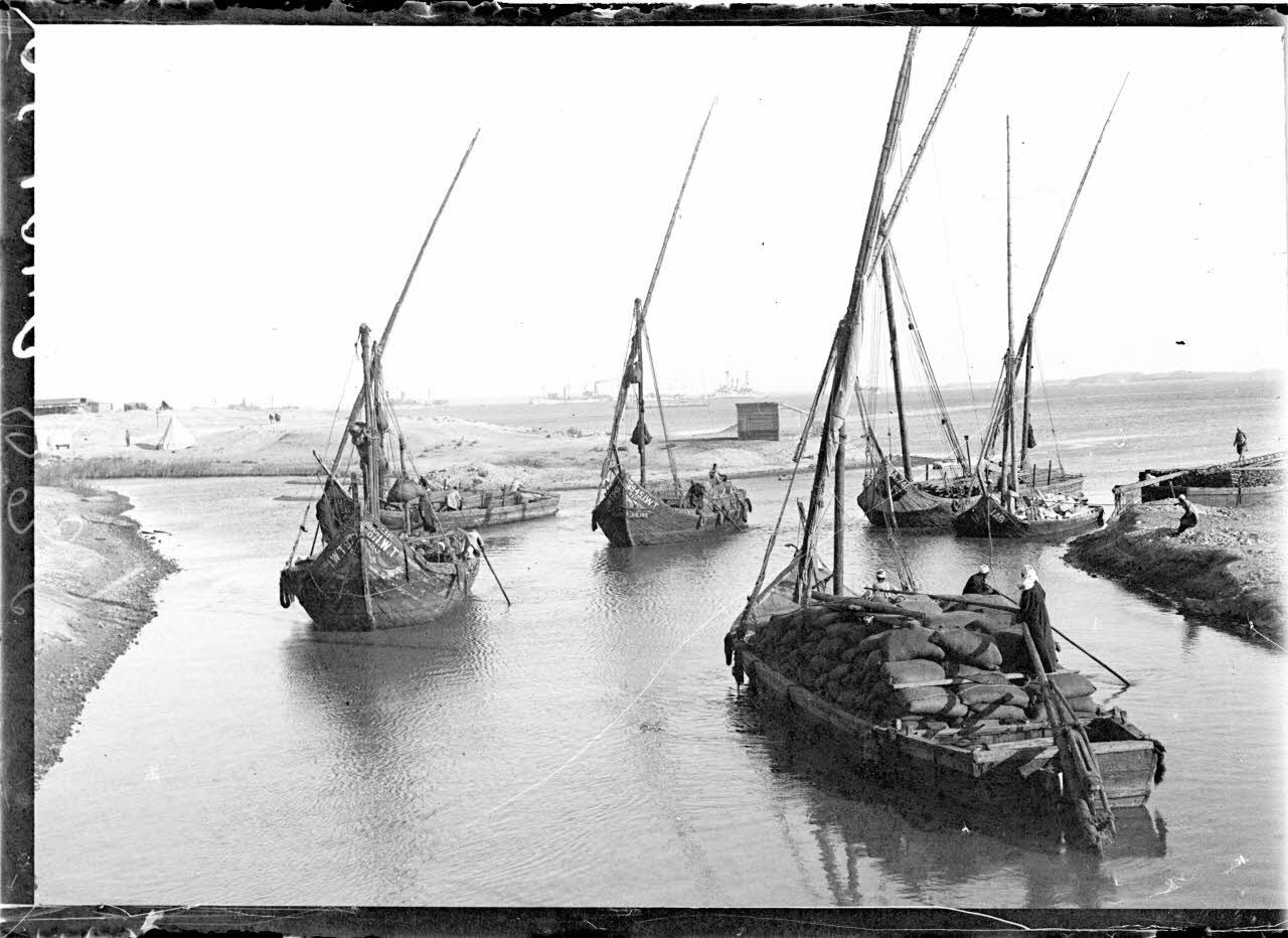 Installations de défense sur les rives : barbelés et tranchées ; le bac reliant Ismaïlia au camp de Ferry Post ; le lac Timsah et le port, près d'Ismaïlia.