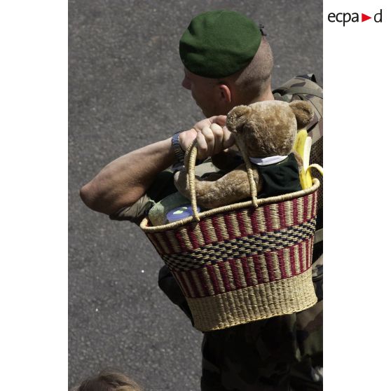 Un légionnaire transporte un sac contenant un ours en peluche d'enfant appartenant à des ressortissants évacués à l'aéroport international d'Abidjan.