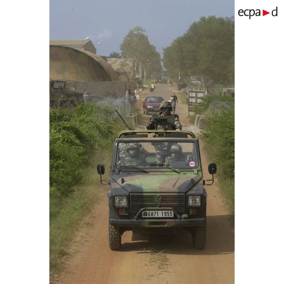 L11 - sujet absent - 22 novembre, Abidjan. Une patrouille de la gendarmerie se dirige vers la résidence des Palmes pour un changement du cryptage des postes radio. Des gendarmes sont en poste à l'entrée nord du camp du 43e BIMa à Port-Bouët.