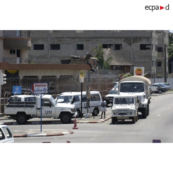 Véhicules de l'ONU (Organisation des Nations unies) stationnés en ville devant le camp de l'ONUCI (forces de l'ONU en Côte d'Ivoire).