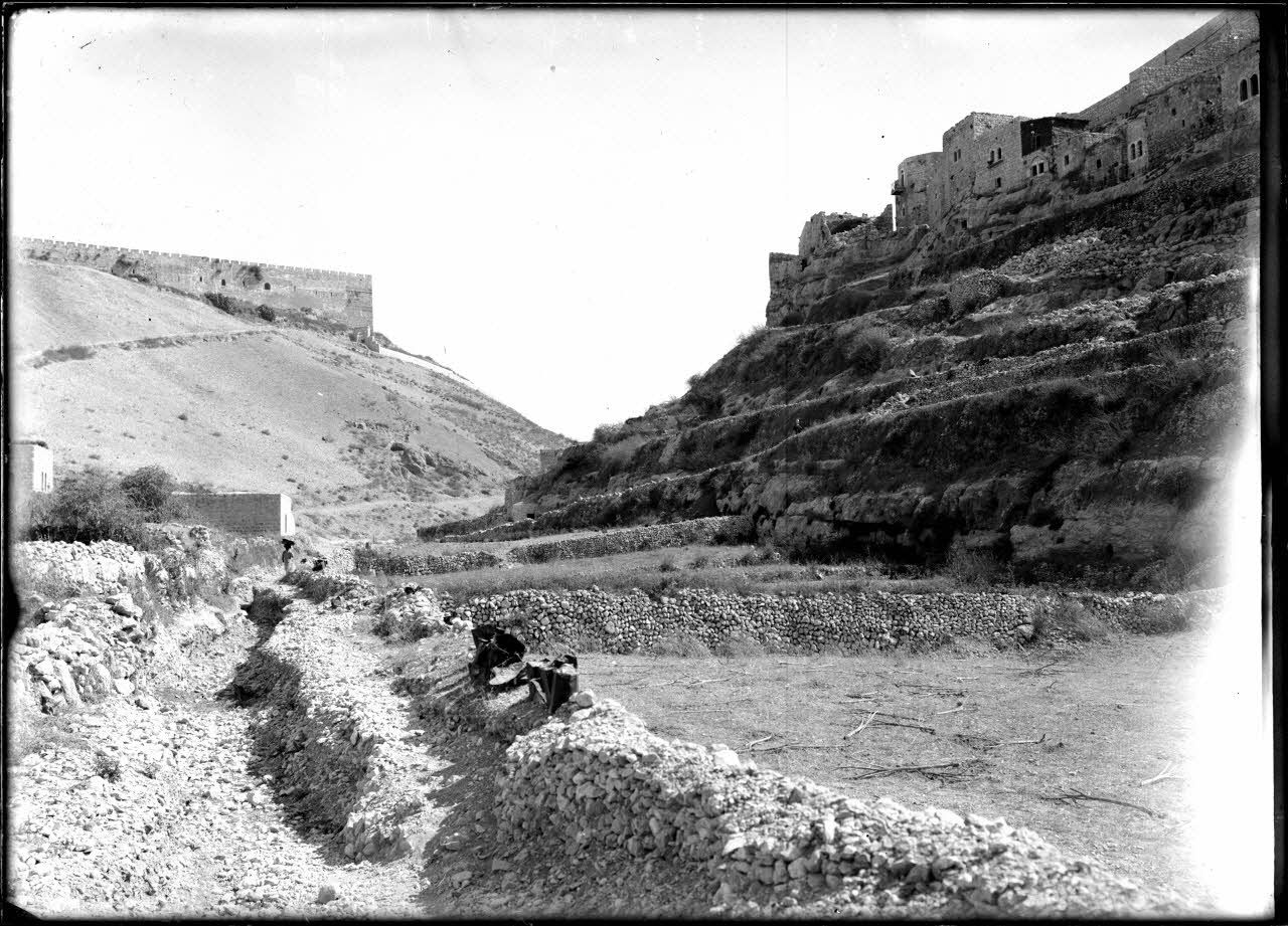 Jérusalem. Palestine. Route de Jéricho. Tranchée du mont Bézéther. Remparts nord de la ville, au fond hospice allemand.