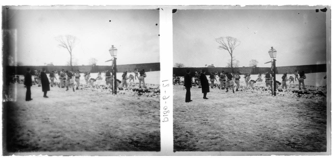 Archives photographiques du lieutenant Emile Coquibus affecté au 6e régiment d'infanterie coloniale (RIC) : loisirs et formation militaire (1906-1907). Après près de quatre années passées en Afrique, en Haute-Guinée (8 février 1901 - 16 janvier 1905), Emile Coquibus revient en France et suit plusieurs formations militaires. L'état de ses services indique qu'il a accompli un stage aux Etablissements Hotchkiss du 31 janvier 1906 au 16 février 1906. Affecté au mois de juillet 1906 au 6e RIC, il quitte ensuite cette unité le 24 mai 1907 pour rejoindre le 4e régiment de tirailleurs sénégalais (voir reportage D180-7). Le lieutenant Coquibus réalise une partie de ces photographies dans le Finistère lorsqu'il est cantonné à la caserne du quartier de Pontanézen, à Brest, au cours de l'hiver 1906-1907.
