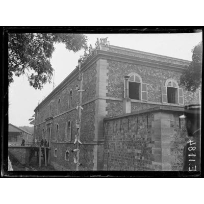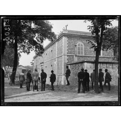 Joinville-le-Pont (Seine). Ecole normale militaire de gymnastique. Le général Margot, directeur de l'Infanterie au ministère de la guerre, sort de l'école avec une délégation de députés et sénateurs qu'il mène sur le terrain.