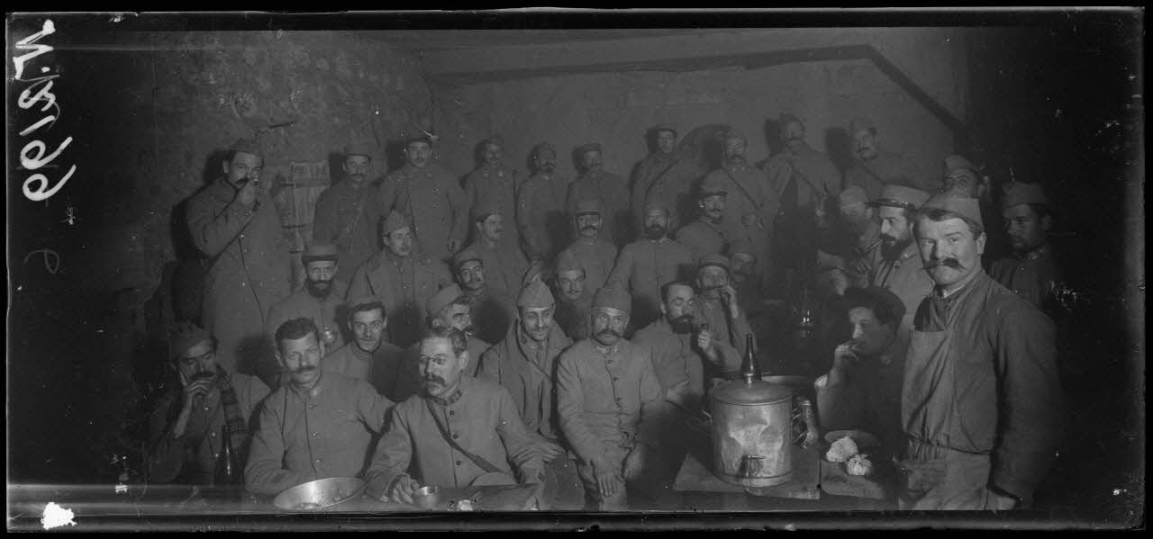Jonchery-sur-Vesle (Marne). Un réfectoire de secrétaires d'état major de la 20e section (janvier 1918). [légende d'origine]