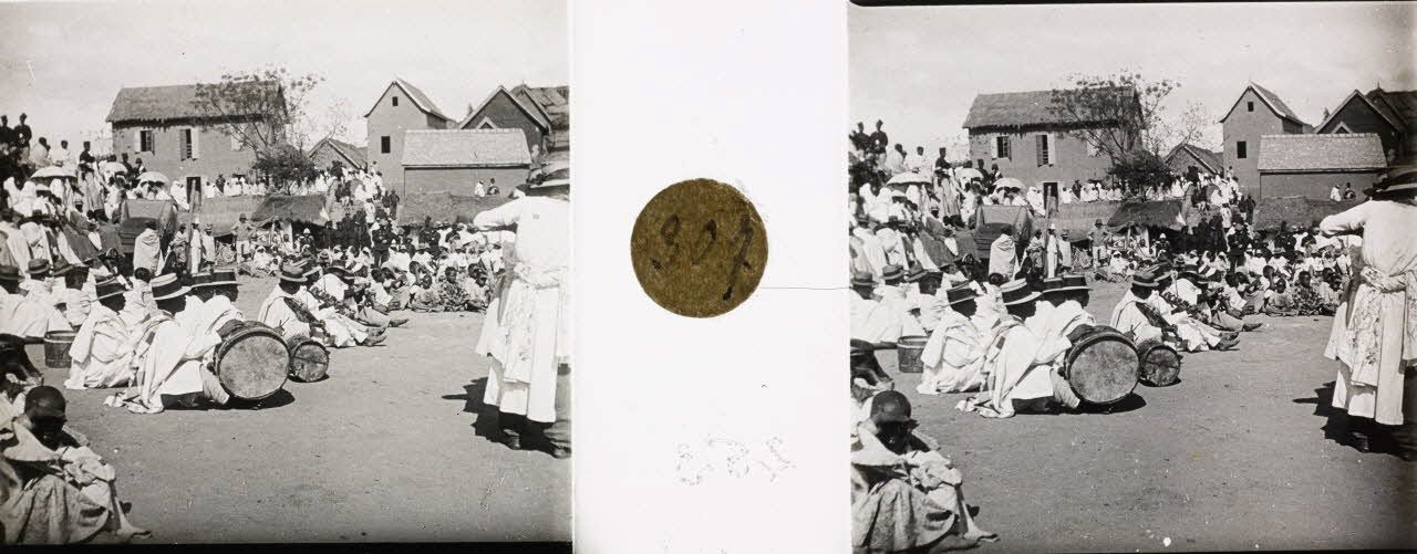 D68-29. Le terme malgache "kabary" désigne à l'origine un discours prononcé par le roi lors d'une assemblée consacrée à la discussion des affaires publiques et, par extension, toute fête traditionnelle publique. René Denis photographie le kabary qui a lieu, après la prise d'armes du 14 juillet 1908, sur l'île du lac Anosy. Une autre de ces réunions se tient à Manjakandriana, à 30 km à l'est de la capitale, où se produisent les musiciens de l'orchestre local, des chanteurs, des conteurs.