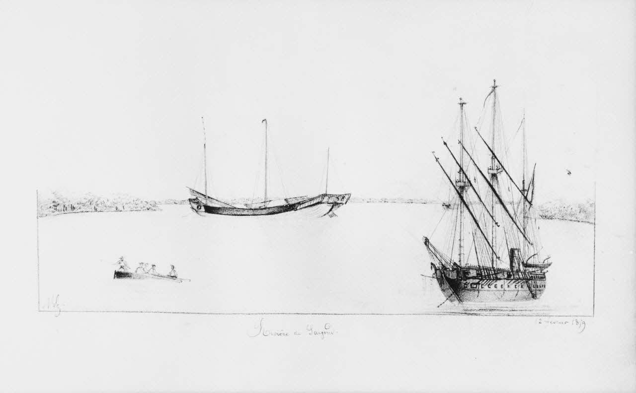 Jonque et frégate de la marine française sur la rivière de Saigon, le 12 février 1859. Signé en bas à gauche. [légende d'origine]