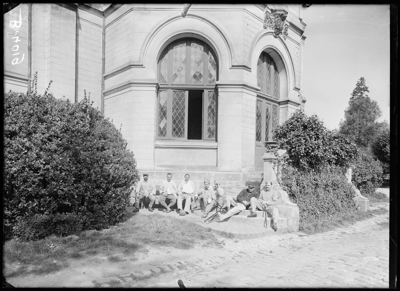 Juilly (Seine-et-Marne), ambulance américaine, blessés sur les marches de la chapelle. [légende d’origine]