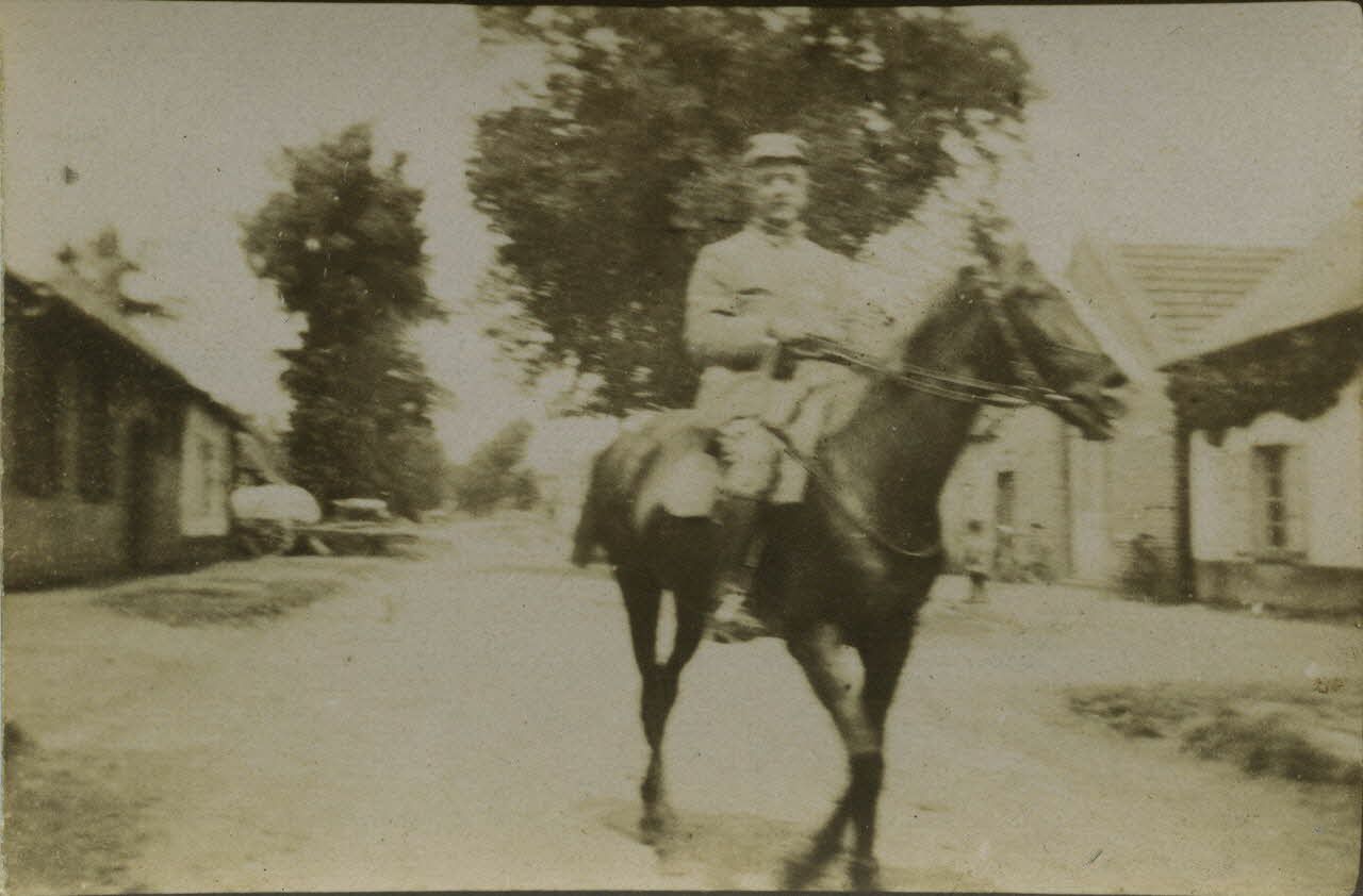 Colonel Desbareau à cheval sortant de son P.C. à Levignen. Nouveau colonel depuis le 26 mai 1917.