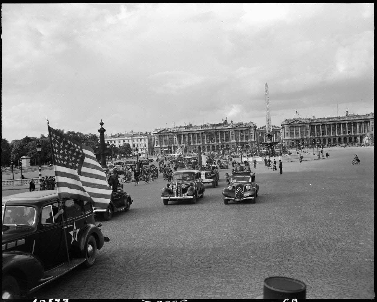 Jules Carron, millionième prisonnier français libéré rapatrié, circule Place de la Concorde à bord d'un Dodge command car de l'armée américaine.