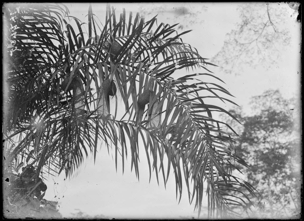 A Kaké, au nord-ouest de Bonabéri, vue d'une branche d'un palmier dans laquelle des oiseaux ont construit des nids d'une forme étrange.
