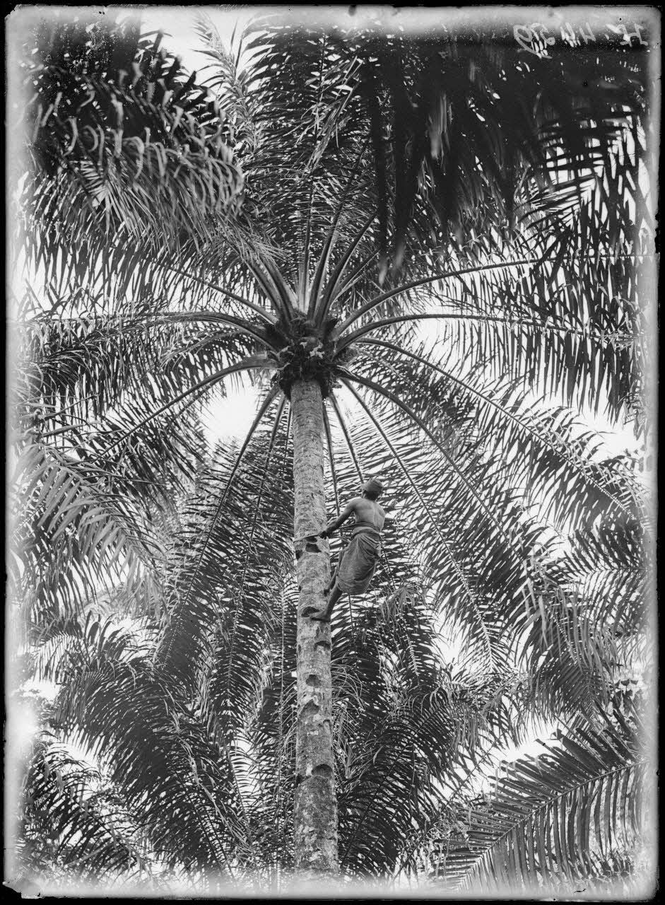 A Kaké, un indigène grimpe en s'aidant d'une lanière le long du tronc d'un arbre, pour aller récolter des coeurs de palmier.