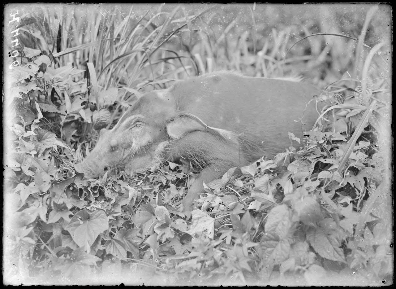 - Dans le village de Kaké, des oiseaux sauvages ont fait leurs nids dans les palmes où erre également un phacochère. Un chasseur de panthères de la race Abo s'apprête à partir.