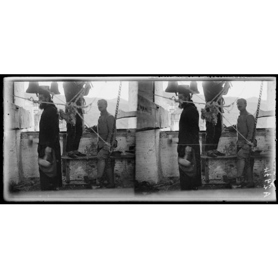 Déchargement d'un wagon dans le port de Salonique.