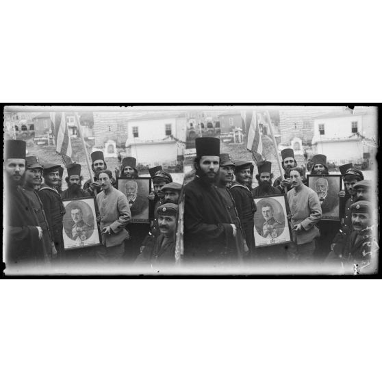 Vatopedi. Les moines promènent en triomphe les effigies du roi et de monsieur Venizelos.