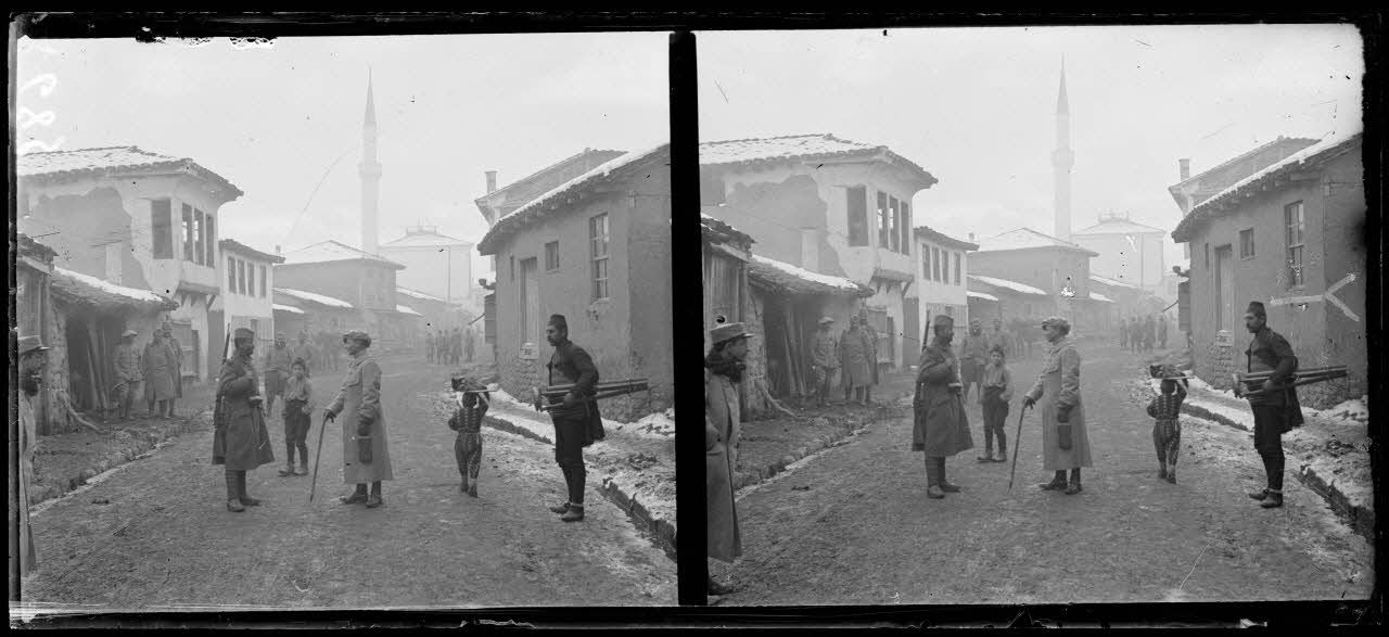 Kavadar. Une rue, mosquée en contrebas. Le capitaine Mascuraud (148e de ligne) l'un des plus jeunes capitaines de l'armée (22 ans, décoré croix de guerre). [légende d'origine]