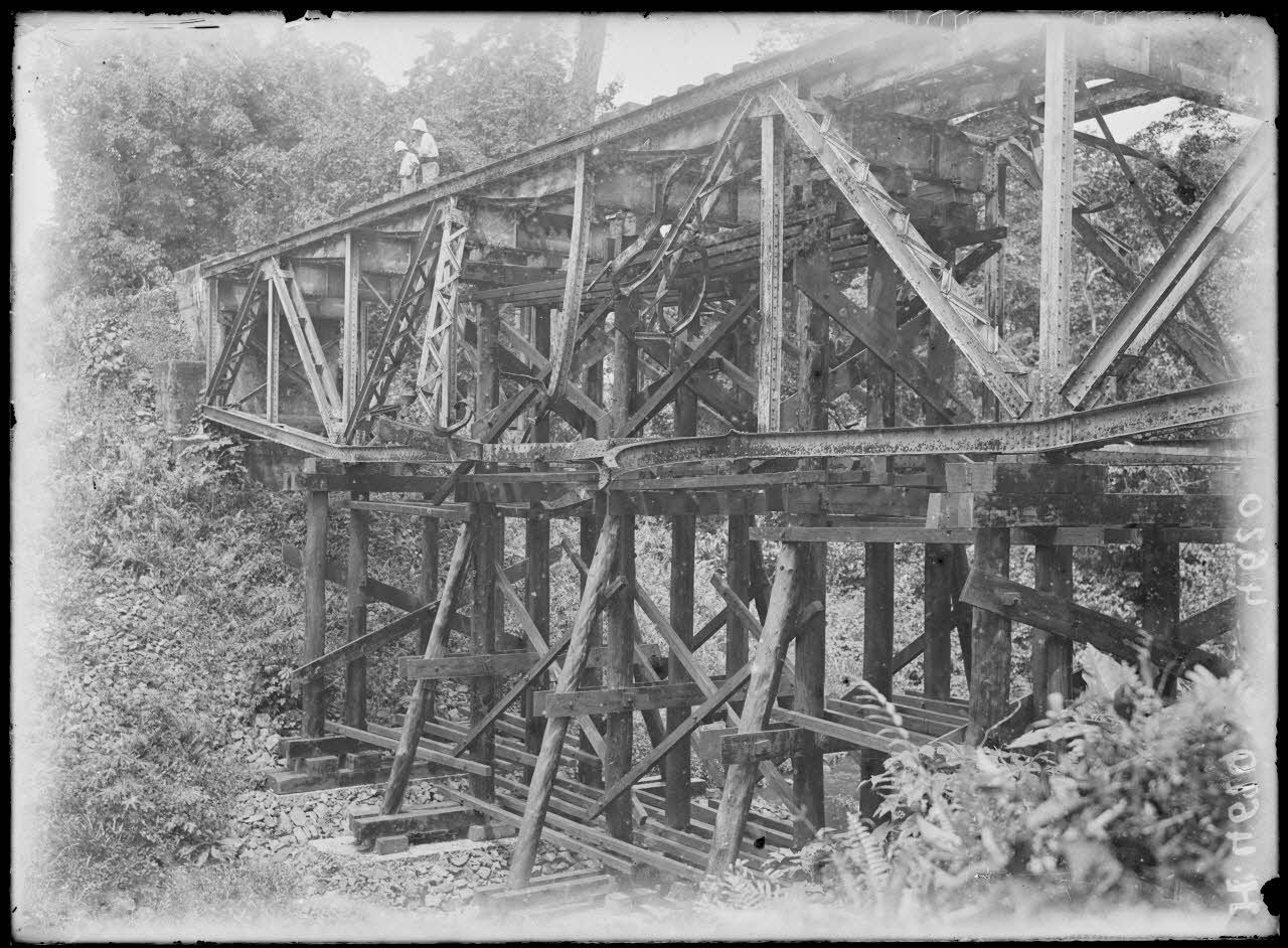 - sur le bras nord de la Sanaga, entre l'île d'Edéa et la rive droite du fleuve, il photographie les réparations du pont ferroviaire endommagé pendant le conflit ;