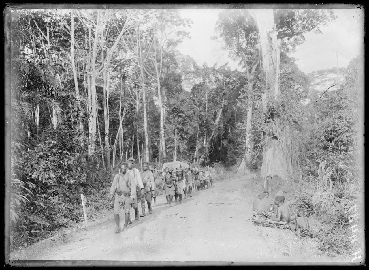 Une colonne de la mission du SPA (service photographique des armées) emprunte la route de Yaoundé le 11 février 1917.
