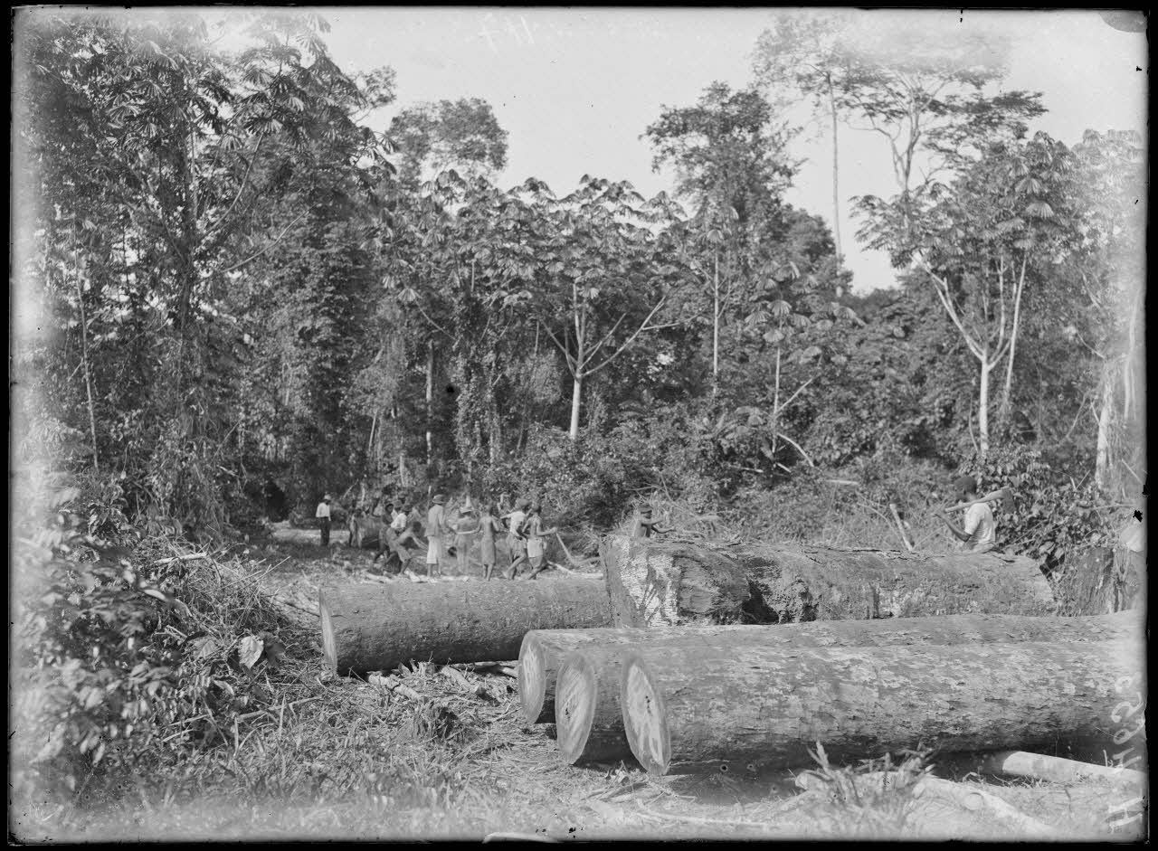 A Kompina des bûcherons abattent des bois tropicaux (bongassi) et effectuent la manutention des billes par roulage sur des rondins à l'aide de cordes.