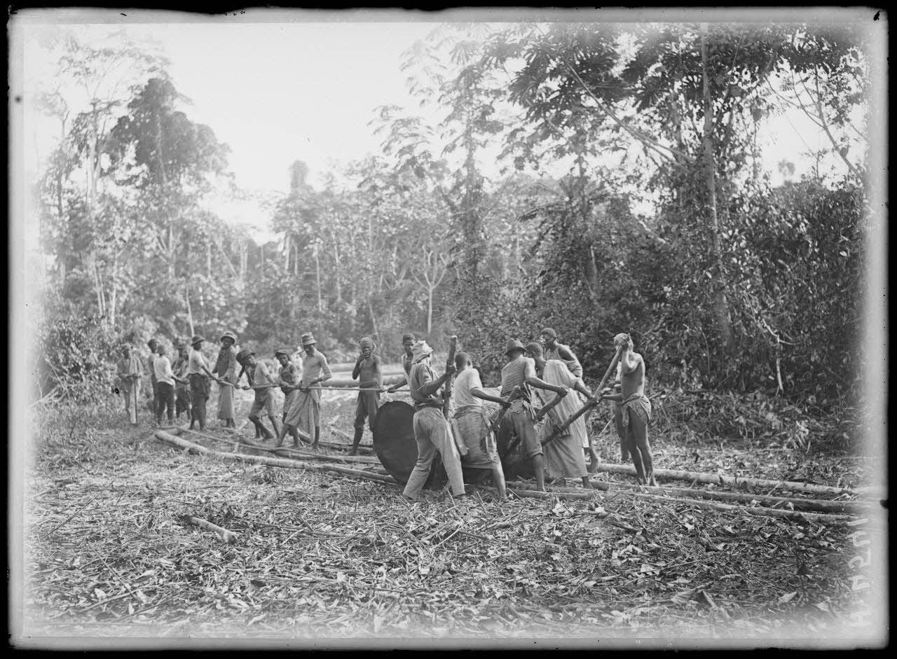 A Kompina, dans une clairière de la forêt vierge, des indigènes font rouler une bille de bois tropical sur des rondins avec des cordes.