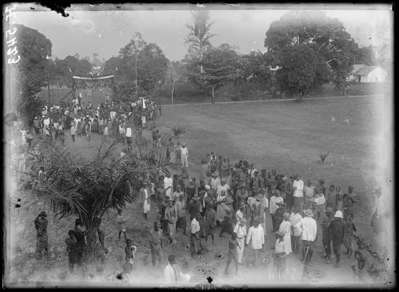 Le 14 juillet 1917, la population de Kribi déambule sur la grande rue de Kribi et passe sous une banderole.