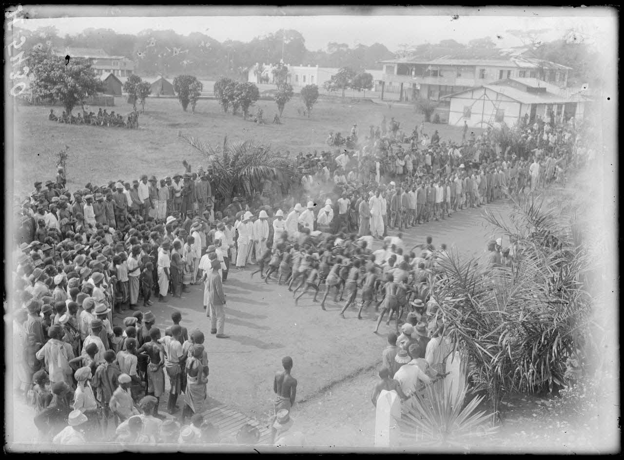 Pour les festivités du 14 juillet 1917 à Kribi, les enfants prennent le départ d'une course à pied devant une foule nombreuse et en présence des autorités. En arrière-plan, le poste militaire des tirailleurs.