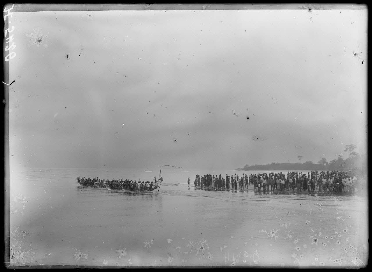 Lors des régates du 14 juillet 1917, une grande pirogue de plus de 50 rameurs double la pointe de l'estuaire de la Kienké, à Kribi. Massée sur la plage, la population locale regarde passer les bateaux.