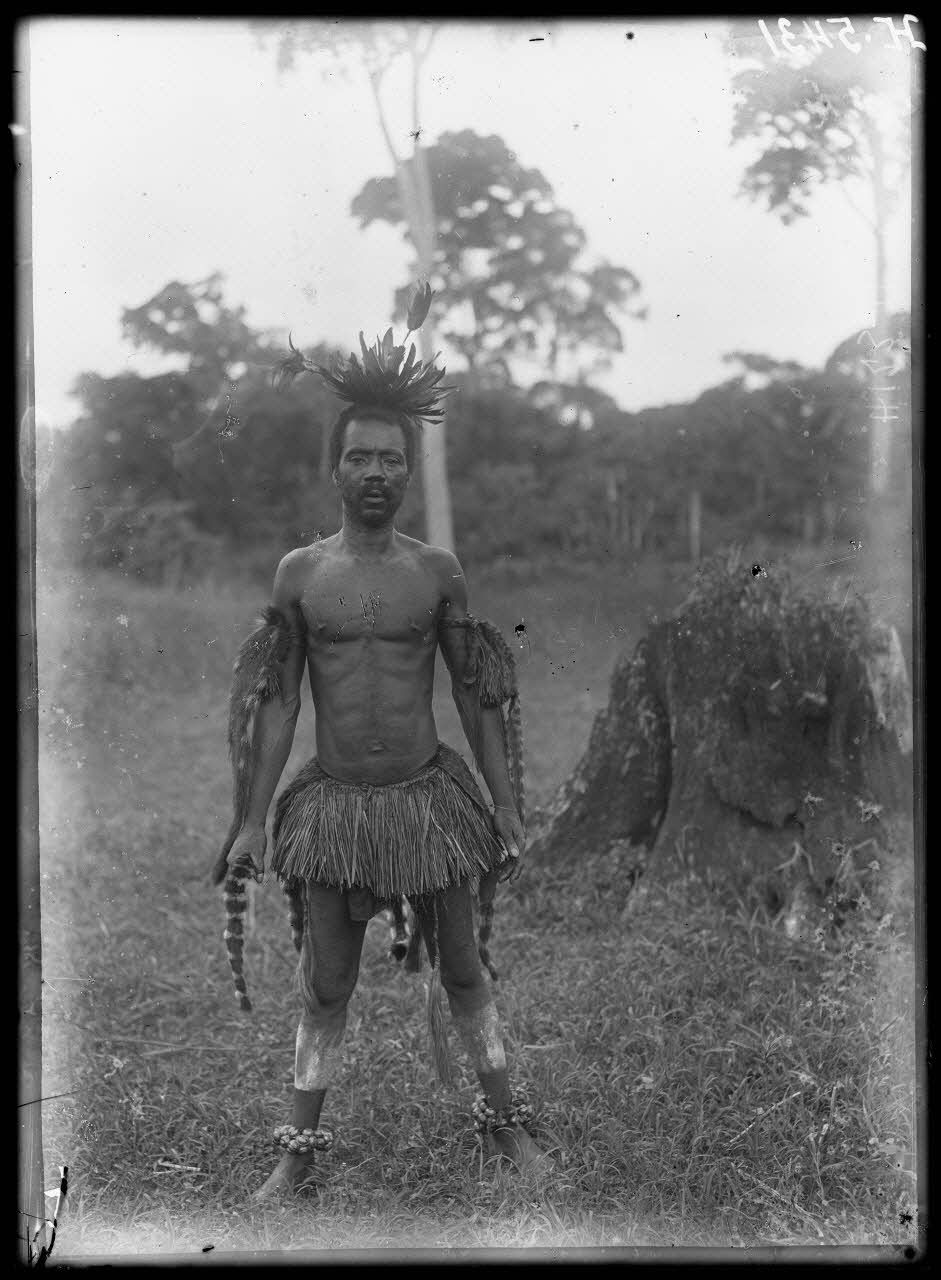 Un homme-panthère de l'ethnie Boulou pose en costume traditionnel : pagne et ornements de raphia, queues de lémuriens, peintures et bracelets de chevilles, coiffe végétale.