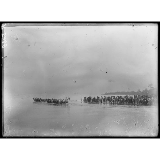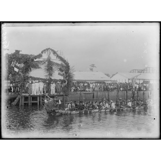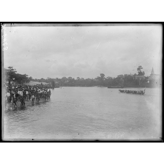 Kribi. Course de grandes pirogues de 58 rameurs. L'arrivée.