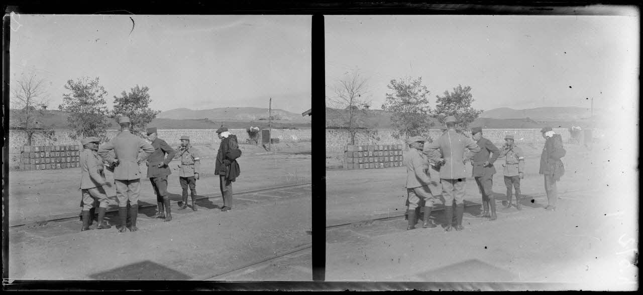 Krivolak. La gare pendant le bombardement. Le général Sarrail, un général de brigade, un officier serbe et un interprète.