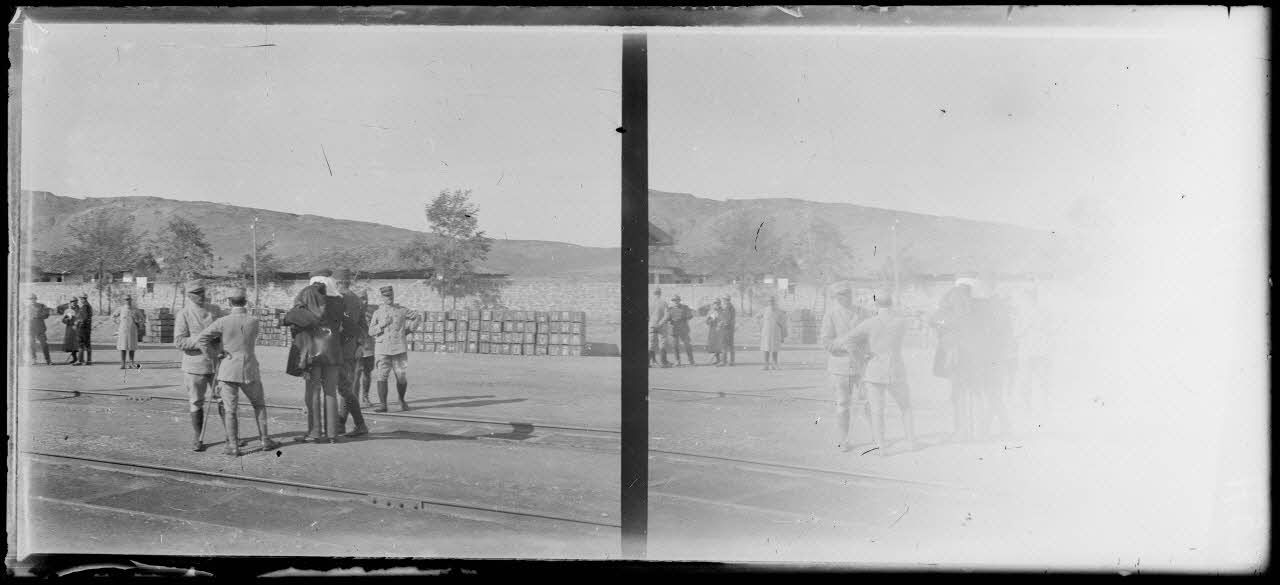 Krivolak. La gare pendant le bombardement. Le général Sarrail, un général de brigade, un officier serbe et un interprète.