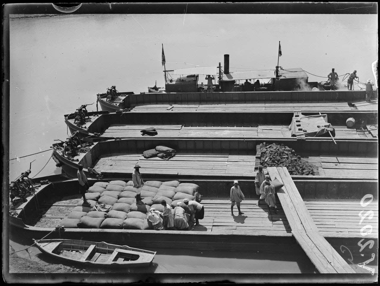 Ksiri. Chargement des chalands de blé sur le Sébou.