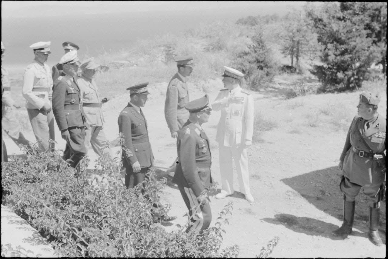 L'amiral italien Inigo Campioni guide son invité le général Martin Fiebig lors de son inspection des positions allemandes du Mont Filérimos.<br>