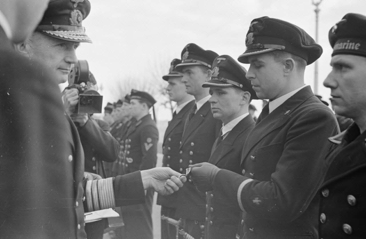 L'amiral Dönitz remet des décorations (croix de fer) en présence du capitaine de corvette (Korvettenkapitän) Herbert Sohler, représentant de la 7.Unterseebootsflottille.