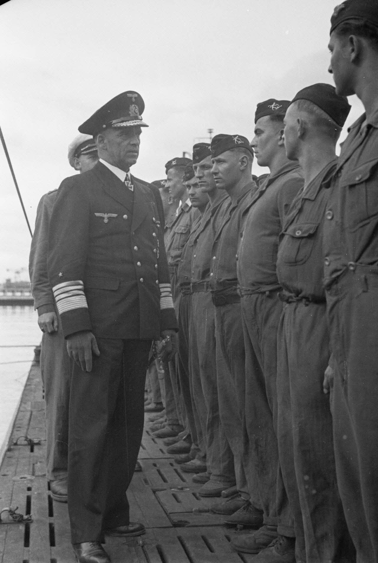 A Saint-Nazaire, l'amiral Otto Schniewind inspecte les personnels de la 7.Unterseebootsflottille peu avant l'appareillage des sous-marins U-93 et U-94.