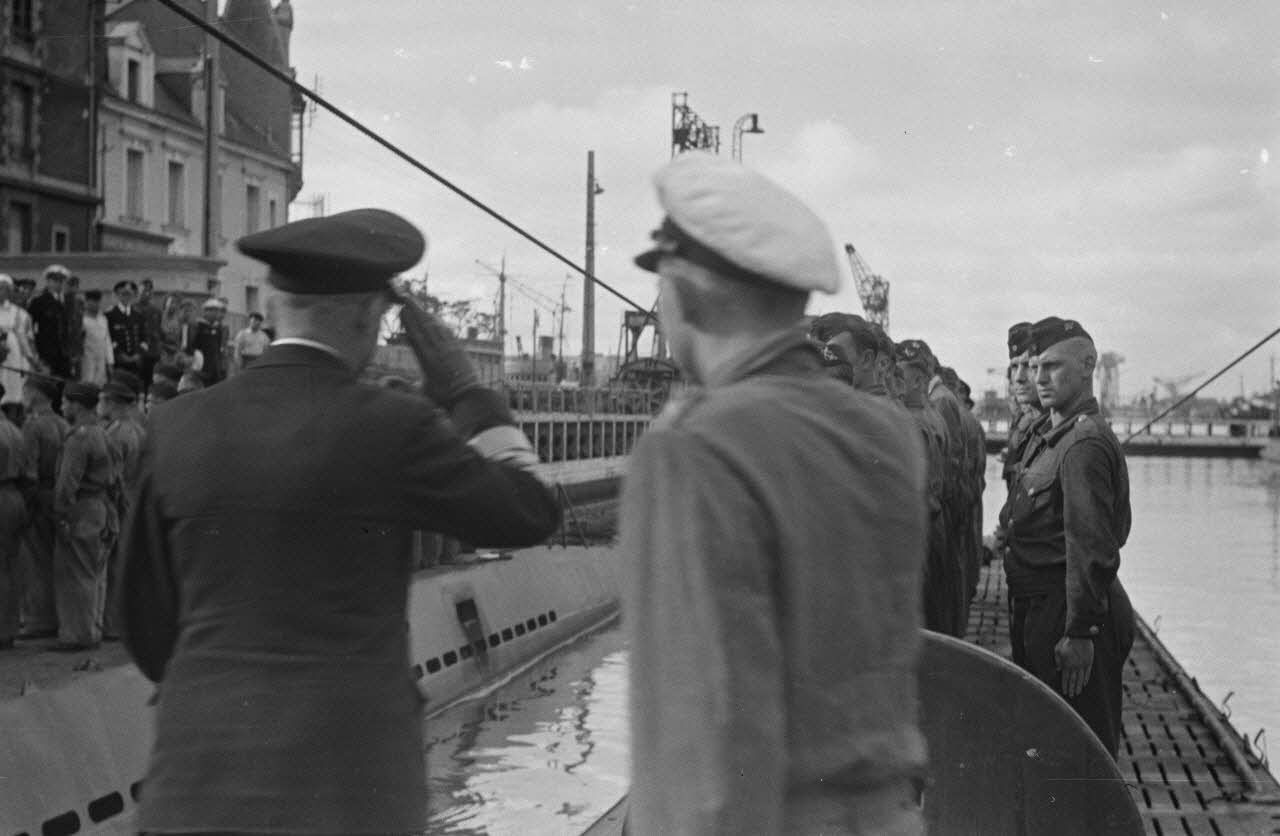 A Saint-Nazaire, l'amiral Otto Schniewind inspecte les personnels de la 7.Unterseebootsflottille peu avant l'appareillage des sous-marins U-93 et U-94.