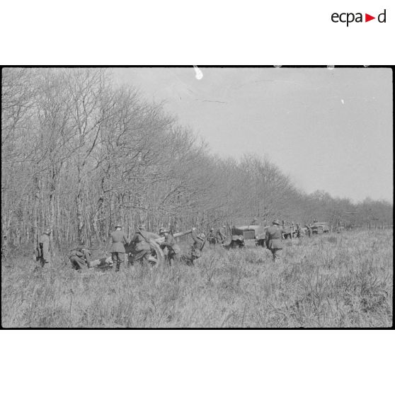 Les artilleurs du 24e RA ou RAD (Régiment d'artillerie divisionnaire) effectuent un exercice de mise en batterie de canons de 75 mm au camp de Ger.