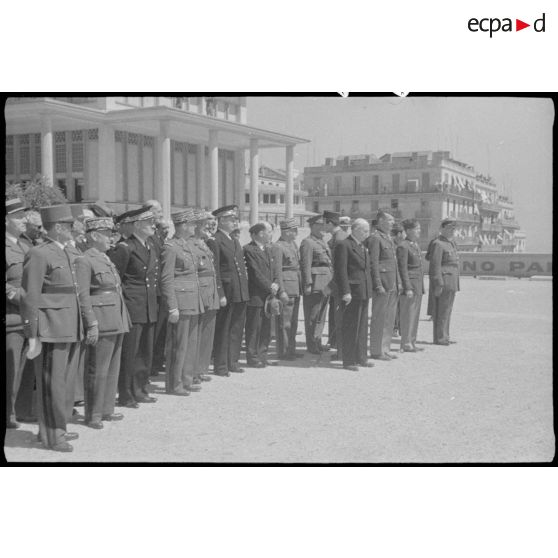 Photographie de groupe rassemblant des autorités françaises et étrangères lors de la cérémonie célébrée par l'armée américaine sur la palce du Forum, à Alger, à l'occasion des funérailles du président Roosevelt.