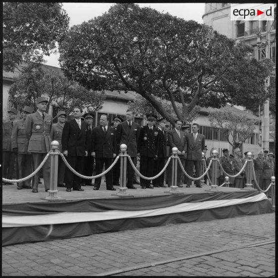 Revue de la garde d'honneur par Robert Lacoste et des officiels lors d'un défilé militaire à Alger.