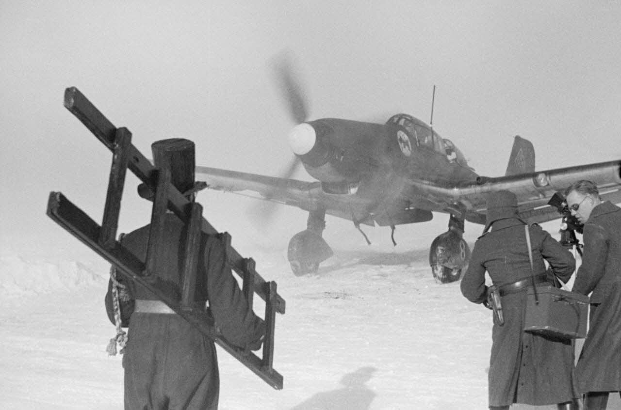 On reconnaît l'insigne du 1./StG.2 sur le nez de l'avion (DAA 2704 L14 et L15). A la descente de l'avion, l'équipage est porté par les pilotes et les mécaniciens du groupe de bombardement. Hans-Ulrich Rudel et Erwin Hentschel posent pour le reporter avec un cochon (porc) dans les bras, un signe de chance.