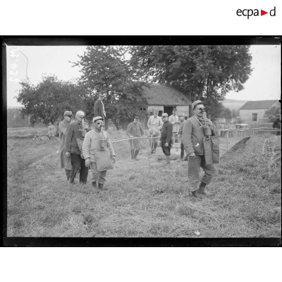 Ecoles des gaz de Barleux dans la Somme, des soldats munis du sac respiratoire descendent dans la fosse.