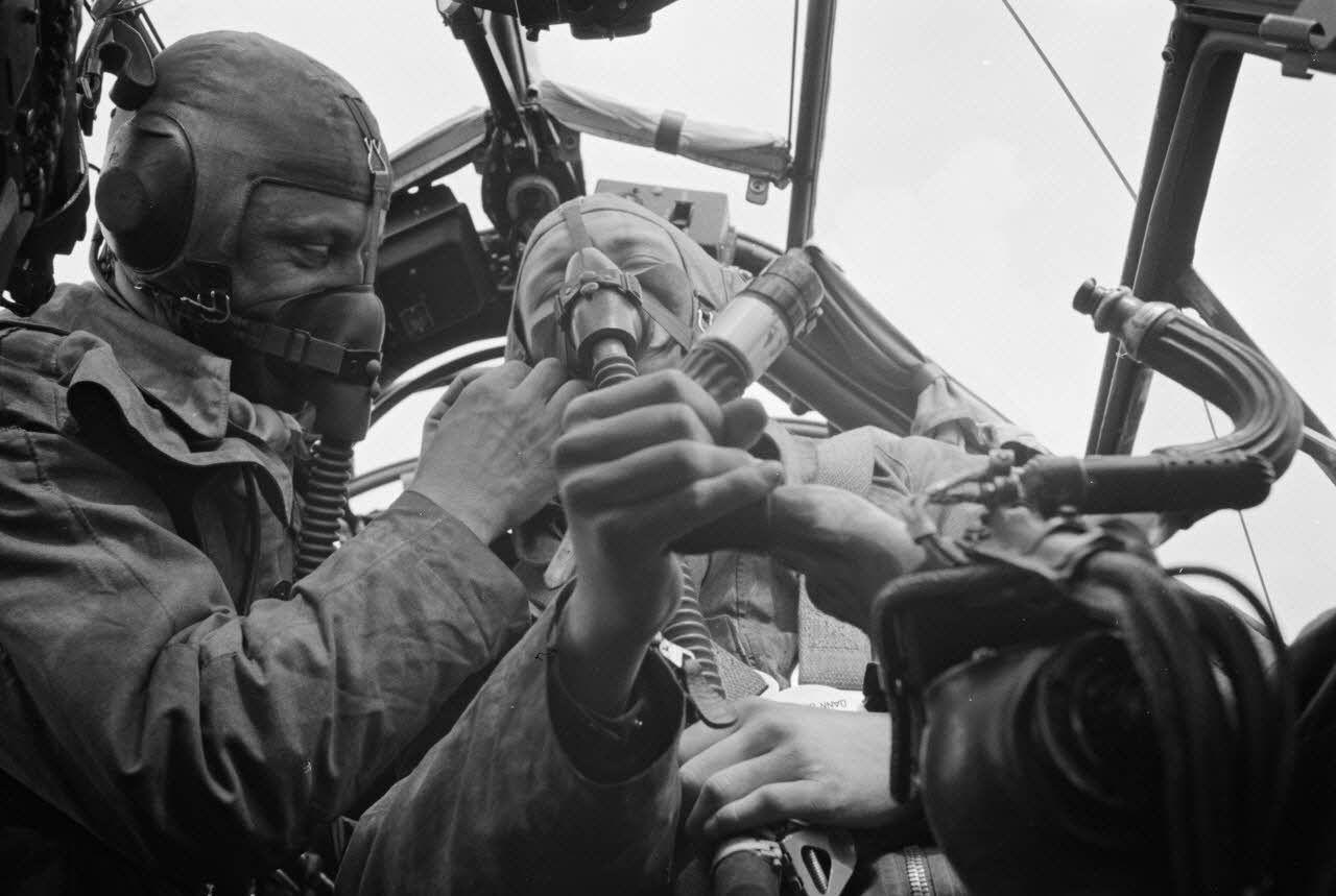 Lecopilote aide son camarade à enfiler le masque à oxygène.