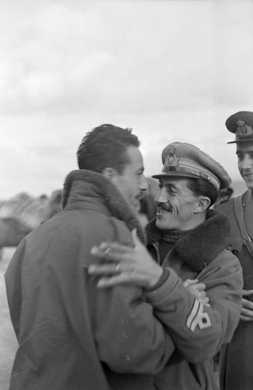 L'équipage d'un bombardier Savoia Marchetti victorieux est accueilli sur le terrain d'aviation d'Héraklion.
