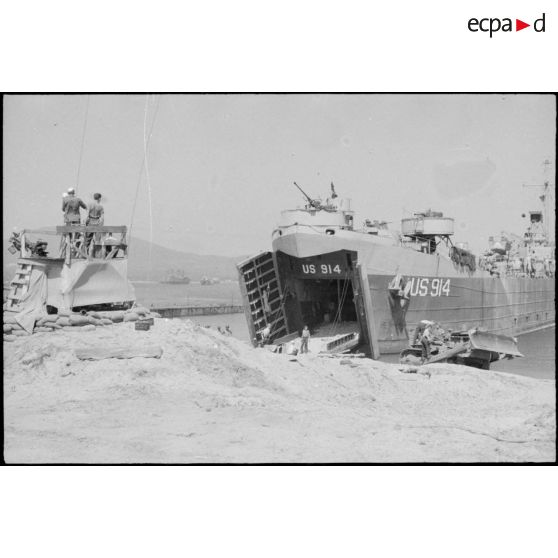 Débarquement de véhicules et matériels d'un landing ship tank (LST) et aménagement de la plage de La Foux dans le golfe de Saint-Tropez.