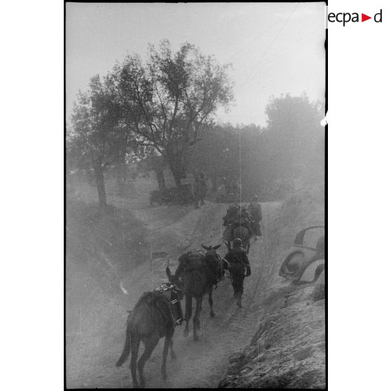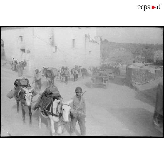 Les tirailleurs du 4e RTM montent en ligne avec des mulets.