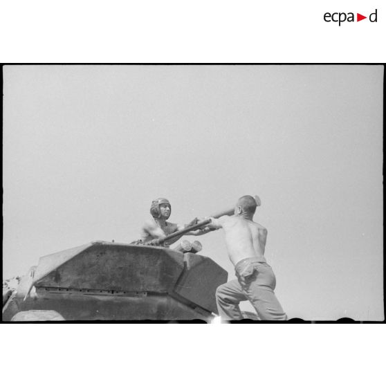 Le chargeur et le tireur d'un chasseur de chars TD M10 du 2e escadron du 7e RCA à Castelforte.