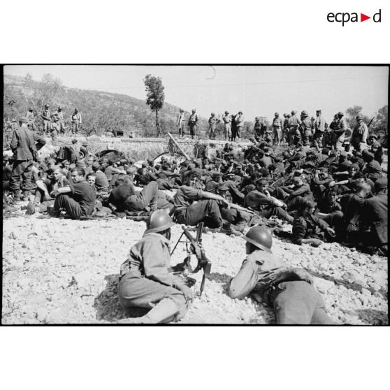 Des soldats allemands faits prisonniers après les combats du Garigliano, sont rassemblés sous la garde de tirailleurs à Monticelli, sur la route d'Esperia.