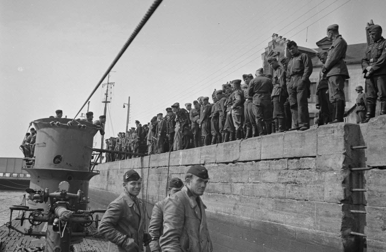 L'équipage du Kapitänleutnant Karl Thurmann commandant du sous-marin U-553 débarque sur le quai du port de Saint-Nazaire où des officiers de la Kriegsmarine l'accueillent.