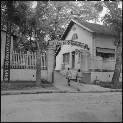 Transport d'un blessé sur un brancard dans un centre de transfusion des FTNV (forces terrestres au Nord-Vietnam).